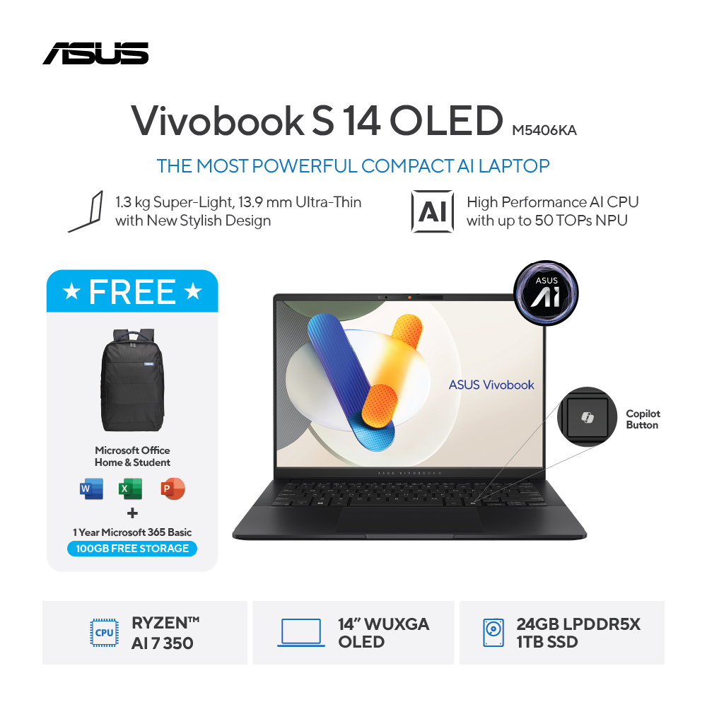 Asus Vivobook S14 OLED M5406KA-OLED7211M [AMD Ryzen AI 7 350|RAM 24GB|SSD 1TB|Win11|OHS24+365|Black]